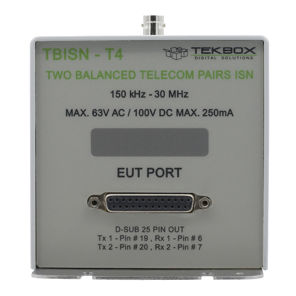 Per CISPR 22 (2005), ISN’s are specialized coupling decoupling devices used for measuring the conducted asymmetric common mode radio interference voltages of ITE. TBISN -T4 has been designed to perform conducted emissions test per CISPR 22 on two balanced p air telecom lines. It meets the requirements for Longitudinal Conversion Loss defined in CISPR 22 item 9.6.2.c)1) page 24 accepted by CISPR.