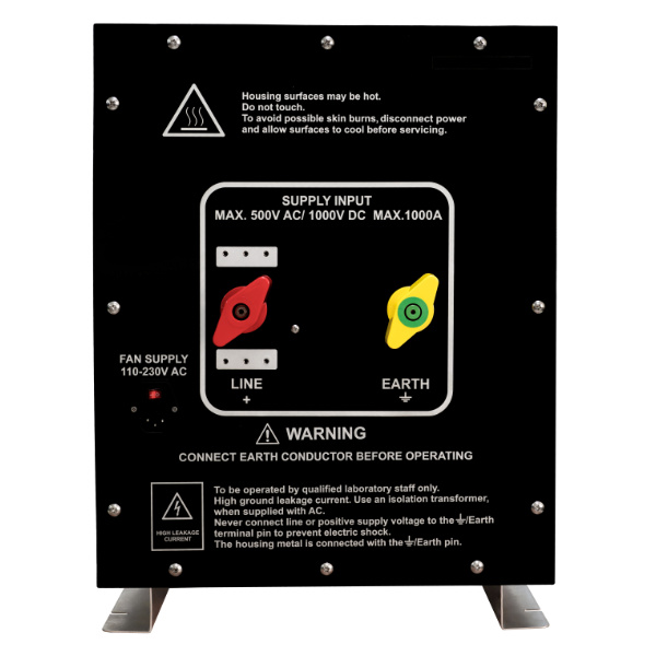The LISN is equipped with fans to enable continuous operation up to 1000 A. The fans are available with either 100 V – 120 V or with 200V – 240 V supply voltage. A C14 connector with integrated switch sits on the rear panel. The LISN can be operated continuously with up to 500 A without fan.