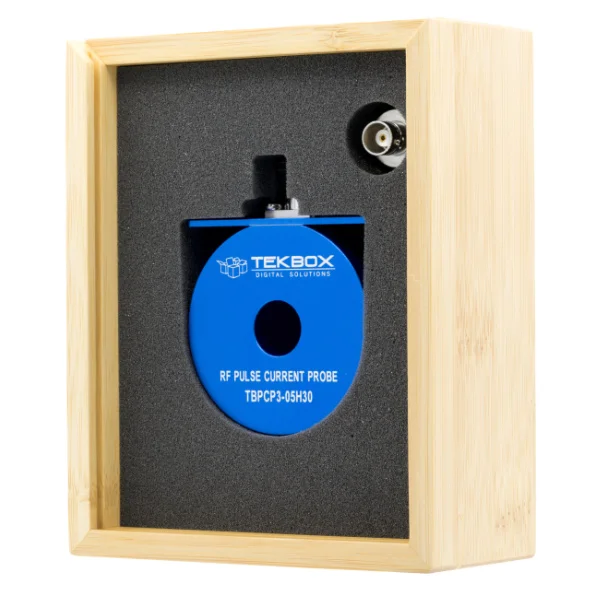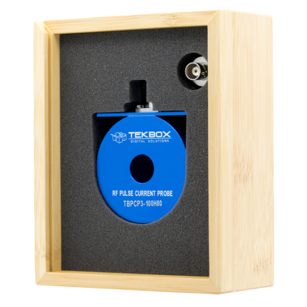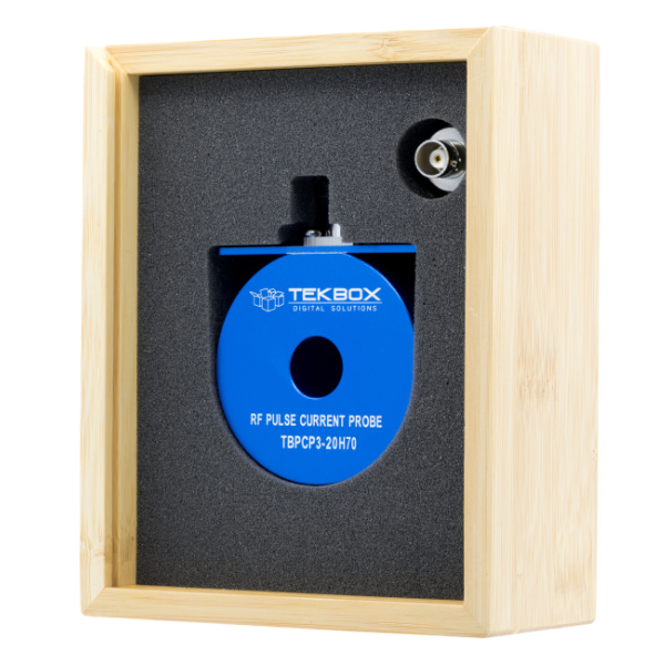 The TBPCP3-100H80 is an RF pulse current monitoring probe. The probe has a 3 dB bandwidth from 100 Hz to 80 MHz and is characterized over the frequency range from 1 Hz to 100 MHz. The TBPCP3-100H80 is typically used for surge or RF pulse current monitoring applications in the time domain, in contrary to RF current monitoring probes designed for EMC applications, which are typically used for measurements in the frequency domain. The aperture of the RF current monitoring probe is 15 mm. The transfer-impedance is -6 dBΩ / 0. 5 V/A when terminated with 50 Ohm and 1 V/A with a high impedance load. The typical 3dB bandwidth is 100 Hz to 80 MHz.