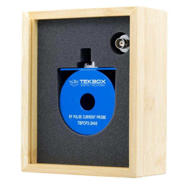 The TBPCP3-2H40 is an RF pulse current monitoring probe. The probe has a 3 dB bandwidth from 2 Hz to 40 MHz and is characterized over the frequency range from 0.1 Hz to 100 MHz. The TBPCP3-2H40 is typically used for surge or RF pulse current monitoring applications in the time domain, in contrary to RF current monitoring probes designed for EMC applications, which are typically used for measurements in the frequency domain. The aperture of the RF current monitoring probe is 15 mm. The transfer-impedance is -20 dBΩ / 0.1 V/A when terminated with 50 Ohm and 0.2 V/A with a high impedance load. The typical 3dB bandwidth is 2 Hz to 40 MHz.