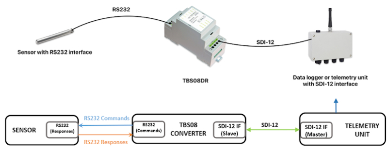 The TBS08DR is a converter to connect a RS232 sensor to an SDI-12 master device such as a data logger or a telemetry unit. It gives the ability to control a RS232 sensor by transparently turning it into a virtual SDI-12 sensor.